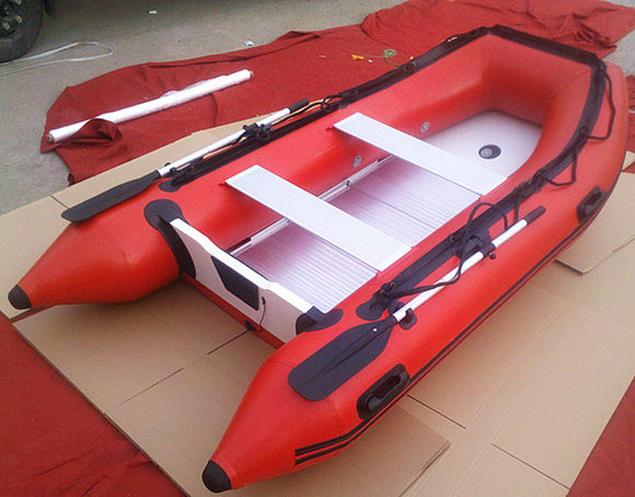 (4)配可拆式塑鋼底板與鋁合金底板,掛機艇艇殼氣囊采用膠粘與高周波熱合工藝加工制作,氣密好、強度高、經久耐用、質量一流。充氣后可保持至少一周。